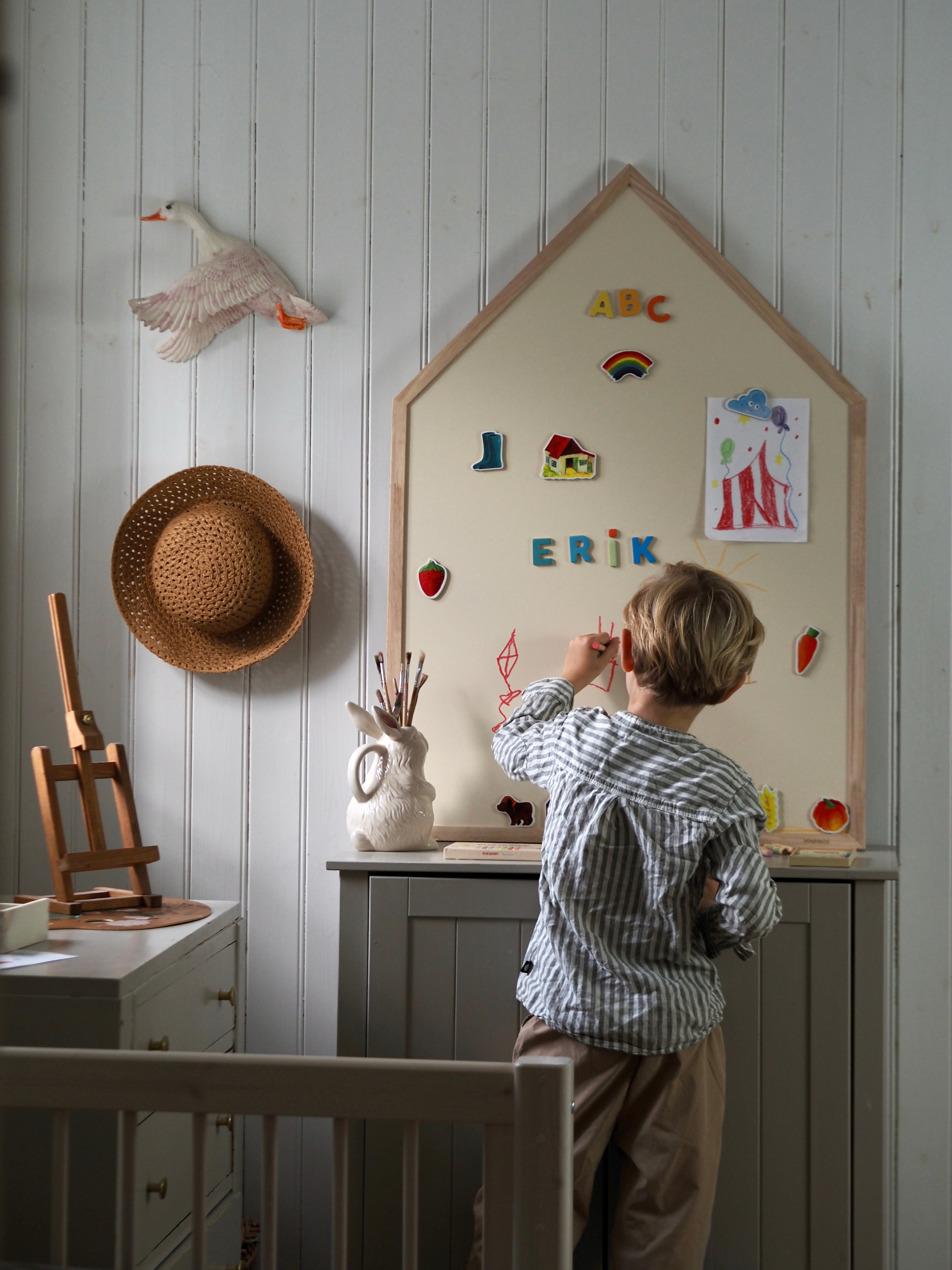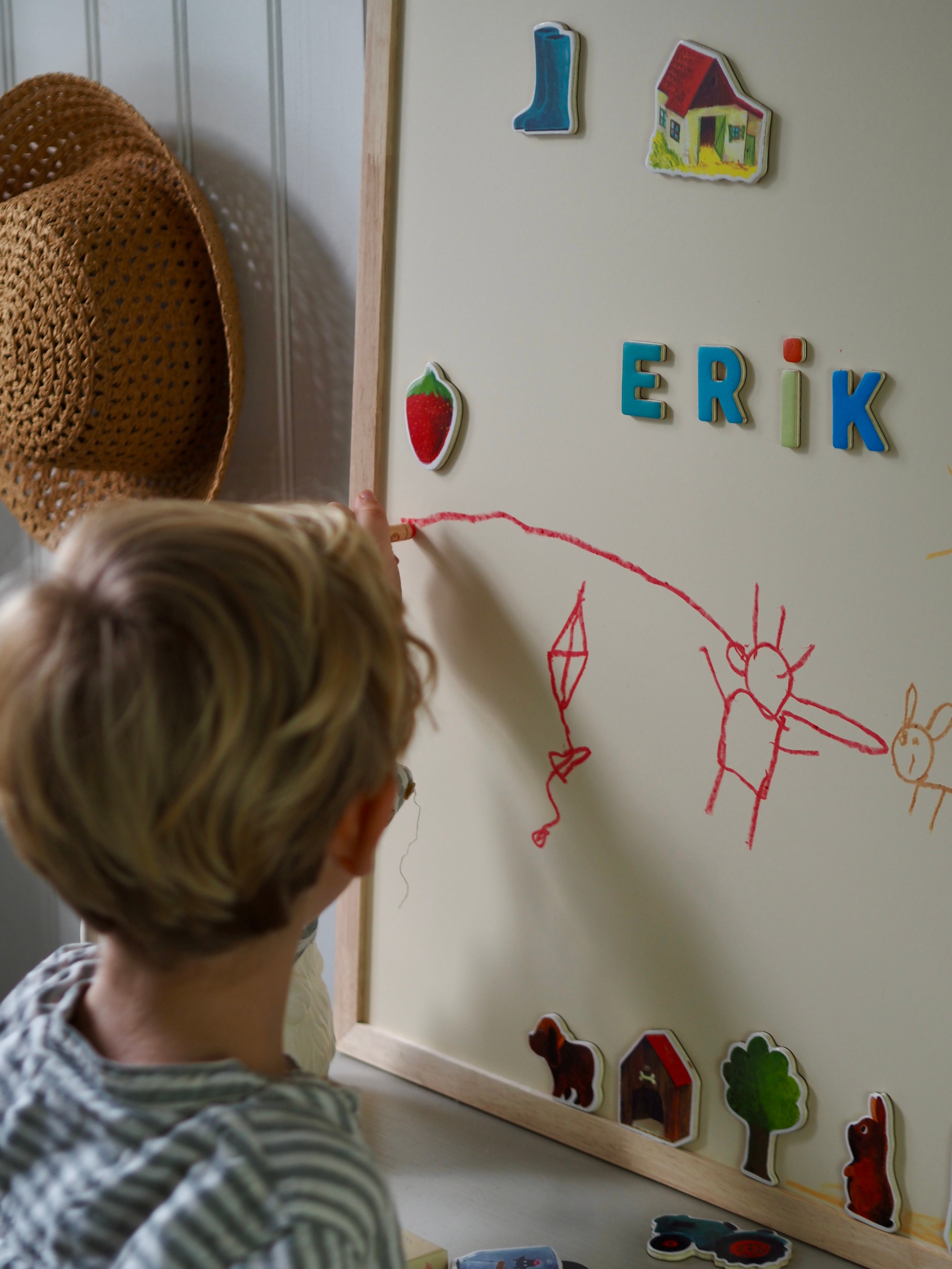 I kan lege med magneter, hænge tegninger op, lave små skoleopgaver eller øve lyden fra en kat. Tavlen vokser med barnet og følger jer gennem mange faser – helt op til skolealderen.