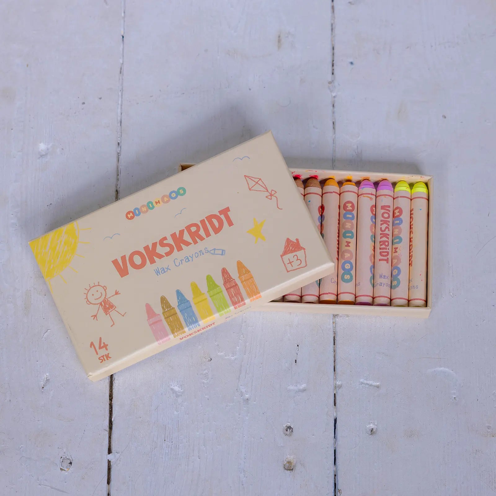 - 14 stk. vaskbare vokskridt (2 af hver)