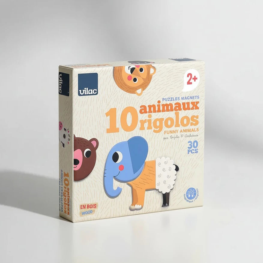 Et magnetisk puslespil i træ, hvor børn kan sammensætte og opfinde deres egne dyr. Sættet indeholder 30 træ dele med magneter, som tilsammen danner 10 forskellige dyr – fx en Gris. Det sjoveste er, at delene kan blandes! Hoveder, kroppe og ben kan sættes sammen på kryds og tværs, så børnene skaber deres egne skøre figurer – måske en “Tigløvfant” eller et “zebrafår”? Her får fantasien og humoren får frit spil, og barnet træner både hånd-øje-koordination og stimulere logisk og kreative tænkning undervejs.